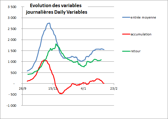 Les 7 février : le nombre d’hospitalisation reste stable à 1500 entrées par jour depuis le 22 janvier. On 7th February, number of entree at hospital is stable since 22d January at a level of 1500.